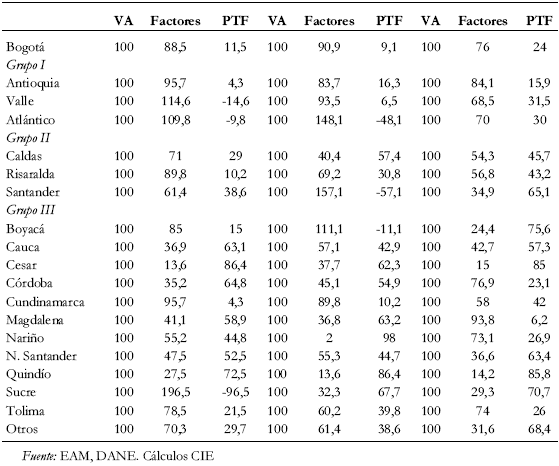 En la tabla 5 aparecen las fuentes de crecimiento desde el lado de la oferta industrial de los departamentos o regiones según la contribución de los factores (capital y trabajo) y de la productividad total factorial (PTF) considerada como indicador de eficiencia productiva, al crecimiento del valor agregado industrial.15
