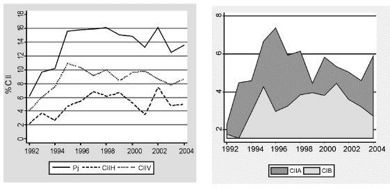 En este estudio se considera entonces que la medida más aproximada del CII es la obtenida para los sectores CIIU a tres dígitos y el agregado industrial a partir de información a ocho dígitos. Este nivel de agregación se acerca más a la idea de intercambio entre productos, reduce los problemas de sobreestimación asociados a la agregación categórica y al comercio intrafirma.