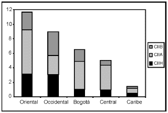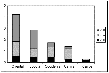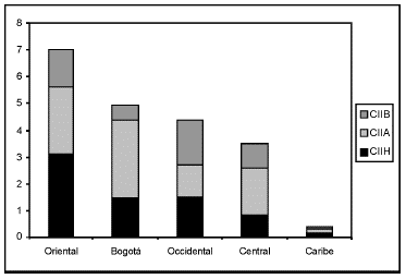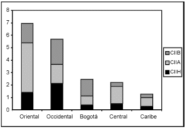 En todas las regiones predominó el CII de naturaleza vertical, a excepción de la región Occidental, donde en promedio el CIIH fue predominante. En el gráfico 6 es evidente como el CIIV determinó el comportamiento del indicador Pj, especialmente en la región Oriental. En esta última y en Central y Caribe predominó el CIIV de alta calidad, mientras que en la región Occidental y Bogotá predominó el de baja calidad.