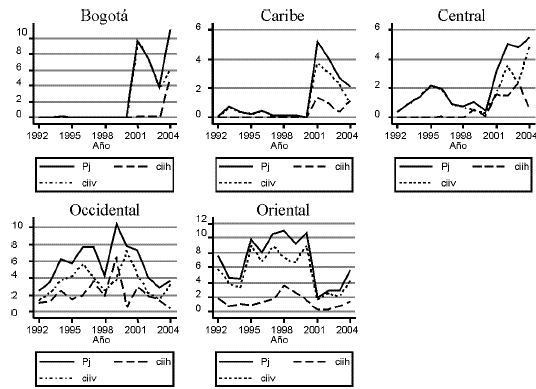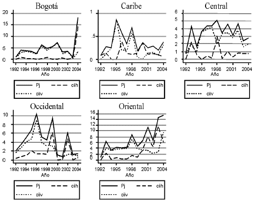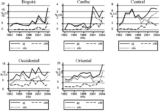 La región Oriental mantuvo el porcentaje promedio de CII más alto en el periodo (7%), seguida de Bogotá (5%), Occidental (4,3%), Central (3,5%) y Caribe (0,36%). La región Occidental, a pesar de estar relativamente cerca de Ecuador y tener un departamento fronterizo, mostró un comportamiento muy inestable del indicador Pj durante el periodo. La región Oriental tuvo un importante repunte en la segunda mitad del periodo, impulsado principalmente por el CIIH, comportamiento igual al observado para Bogotá en el año 2004 (gráfico 7).