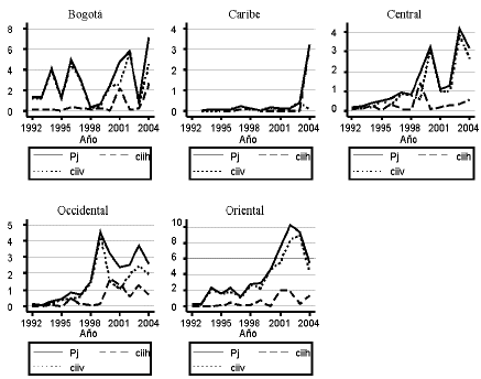 Con el fin de analizar el comportamiento y composición del CII entre cinco regiones colombianas14 y la CAN, se calculó el indicador Pj para cada una de ellas a nivel global y sectorial, descompuesto según su naturaleza y calidad. Igualmente, se realizó este cálculo para los 21 departamentos que componen las regiones. El gráfico 3 presenta el comportamiento del indicador Pj descompuesto según la naturaleza del CII en el periodo 1992-2004.