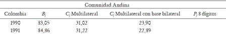 Para evidenciar los mencionados inconvenientes de agregación y sesgo geográfico, en la tabla 1 se presentan diferentes estimaciones del CII de Colombia hacia la Comunidad Andina. En la primera columna se encuentra el indicador Bj, calculado con información de la clasificación CIIU a 3 dígitos. En la segunda columna se encuentra el indicador Cj multilateral, calculado a partir de información a cuatro dígitos, sin ponderar el comercio a cada país de la Comunidad Andina (equivale a calcularlo como si esta fuera un solo país). En la tercera columna se presenta el indicador Cj multilateral con base bilateral, donde se corrige el problema del sesgo geográfico ponderando la participación de cada socio en el bloque. En la última columna se presenta el indicador Pj, donde se intentan corregir posibles problemas de agregación al utilizar una base mucho más desagregada que la correspondiente al indicador Cj, en este caso partida arancelaria a ocho dígitos.