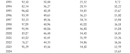 Moscoso y Vásquez (2004) miden la evolución del CII en el Grupo de los Tres (G3) en el periodo 1994-2003, a partir de datos para cada país según la Clasificación Uniforme de Comercio Internacional CUCI revisión 2 a 5 dígitos,8 utilizando el índice GyL no desequilibrado sobre una base bilateral.9 Nuevamente, en este trabajo no se encuentran diferenciados los tipos de CII (horizontal y vertical).10 Los autores encuentran que el comercio intraindustrial en el G3 se concentró en tres secciones de la CUCI, indicando una débil diversificación de los productos exportados al interior del grupo. Globalmente, las secciones no presentaron mayores variaciones del índice de comercio intraindustrial entre 1994 y 2003 (Moscoso y Vásquez, 2004, p. 21). Del CII entre Colombia y Venezuela, los autores encuentran que el comercio industrial estuvo más integrado y, posiblemente, adquirió una nueva dimensión después de la creación del G3 (Moscoso y Vásquez, 2004, pp. 26-27).