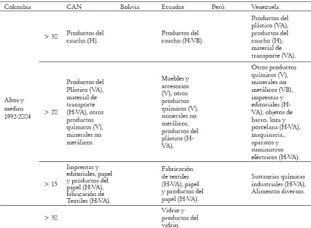 Los sectores que presentan niveles sostenidos de CII entre Colombia y la CAN corresponden principalmente a aquellos de producción de bienes estandarizados de industrialización media (productos de plástico, otros productos químicos, imprentas y editoriales, papel, textiles, vidrio y muebles) o integrados a cadenas de producción mundial con presencia de empresas multinacionales (productos de caucho, particularmente la producción de llantas y neumáticos y material de transporte, particularmente la industria automotriz). El hecho de que el CII sea predominantemente de naturaleza vertical sugiere que la diversificación de estos productos se da en términos de calidad, aunque también es observable la diferenciación por atributos secundarios en industrias con CIIH, especialmente en la de productos de caucho. También existe una presencia importante de sectores productores de bienes basados en recursos naturales (objetos de barro, loza y porcelana, minerales no metálicos e industria de la madera).