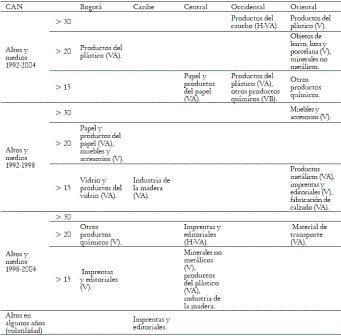La región Oriental, además de tener el porcentaje de CII promedio más alto en el periodo, es la que concentra el mayor número de sectores con altos niveles durante todo el periodo, lo cual puede estar explicado en parte por su creciente especialización en bienes de tecnología media y alta (Moreno, 2007).15 La heterogeneidad regional también se refleja en la composición sectorial en cada una de las categorías, con algunos rasgos comunes como la participación en todo el periodo del sector de plástico en las regiones Oriental, Bogotá, y Occidental (tabla 3).