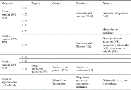 Tabla 4. CII entre las regiones de Colombia y Venezuela, por sectores industriales