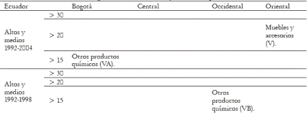 El comercio intraindustrial con rasgos estructurales en el período es más diversificado con respecto a Venezuela que con respecto a Ecuador (para el caso de Perú y Bolivia es inexistente). Sin embargo, la disminución en los porcentajes de CII con Venezuela desde 1998 se refleja en el hecho de que cuatro sectores perdieron importancia en Venezuela, mientras que ninguno la ganó en el periodo subsecuente. Contrariamente, solo el sector de vidrio perdió importancia desde 1998 en el CII con Ecuador, mientras que tres nuevos sectores presentaron niveles promedio significativos entre 1998 y 2004.