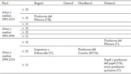 El único sector con CII persistente durante todo el período es el de productos de plástico de Bogotá. El incremento observado para la región Oriental en la segunda mitad del periodo esta explicado por la entrada de tres sectores de CIIV: plástico, papel y otros productos químicos. Al igual que en Venezuela, en Perú está presente el CII de productos de caucho con la región Occidental.