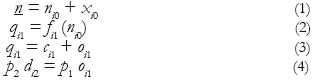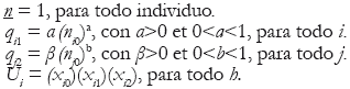 El individuo i se caracteriza por: la producción de bien 1, la cual denotamos como (qi1), el autoconsumo de bien 1 denotada como (ci1 o también xi1), la oferta de bien 1 que se denota por la letra (oi1); y la demanda de bien 2 denotada por la letra (di2). El individuo j se caracteriza por la producción de bien 2 denotado como (qj3), el autoconsumo de bien 2 denotado como (cj2 ó xj2), la oferta de bien 2 denotado por la letra (oj2), y la demanda de bien 1 denotado por la letra (dj1). La producción está especificada por dos tipos de función de producción: fi1 y fj2, de donde se tiene, por un lado, que qi1 = fi1 (ni0) para todo i, y, por otro lado, que qj2 = fj2 (nj0) para todo j. Por simplicidad, dejamos de lado el capital. El consumo está especificado por una función de utilidad del tipo Uh = Uh (xh0; xh1; xh2) para todo h.