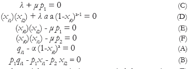 La condición (5) expresa la optimalidad del arbitraje entre el bien 0 y bien 1, mientras que la condición (6) expresa la optimalidad del arbitraje entre bien 1 y bien 2. En el programa de maximización bajo restricciones un agente i cualquiera2 permite establecer un sistema de 6 ecuaciones con 6 incógnitas, que determinan los valores óptimos de: ni0, xi0, qi1, ci1, oi1, di2.