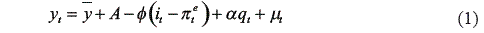 La función de pérdida refleja el objetivo del banco central de mantener la estabilidad macroeconómica, donde λ representa la aversión a las desviaciones del producto respecto de las desviaciones de la inflación. Tanto θ como δ son mayores que cero y t ε es un shock inflacionario ruido blanco. Por su parte, y, p, y q son el producto, la inflación y el tipo de cambio real actuales respectivamente, la variable x indica el valor meta o de equilibrio de largo plazo. La curva de demanda agregada (IS) de una economía abierta tiene la siguiente forma: