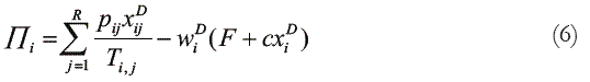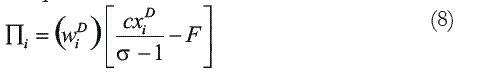 donde lDij representa la fuerza de trabajo industrial que se usa para la producción de una variedad en i y vendida en la región j ; F son las unidades de coste fijo que se necesitan para la producción del bien manufacturado; c es el coste variable unitario y xij D es la cantidad de la variedad demandada en la región j y producida en la región i . Como consecuencia de la existencia de rendimientos crecientes a escala, la preferencia por la variedad de los consumidores y la existencia de un número ilimitado de variedades potenciales del bien manufacturado, cada variedad es producida por una única empresa especializada y localizada sólo en una región. De esta manera el número de empresas manufactureras coincide con el número disponible de variedades. Una empresa característica de la localización i maximiza la siguiente función de beneficios