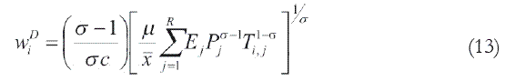 Esta ecuación se denomina ecuación nominal de salarios en la literatura de la Nueva Geografía Económica y constituye el caballo de batalla de un gran número de trabajos empíricos. De acuerdo con la ecuación (13) el nivel de salario nominal en la región i depende de una suma ponderada de la capacidad de compra de todas las regiones j, donde el factor de ponderación es una función de distancia que decrece a medida que la distancia entre dos localizaciones cualesquiera i y j aumenta. El significado de esta ecuación es que aquellas localizaciones con un buen acceso a mercados grandes tenderán a remunerar mejor a sus trabajadores debido al ahorro en costes de transporte.
