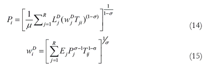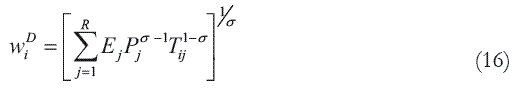 La ecuación nominal de salarios, ecuación (15), nos da el salario industrial para que las empresas en cada localización cubran sus costes teniendo en cuenta niveles de renta, índices de precios y costes de transporte en las distintas localizaciones.