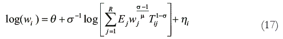 La estimación del modelo de Krugman (1991b) presenta un problema porque habitualmente no se dispone de datos sobre el índice de precios de los productos manufacturados ( Pi ) a ningún nivel de agregación regional. Aplicando logaritmos a la ecuación (15) se obtiene la siguiente expresión: