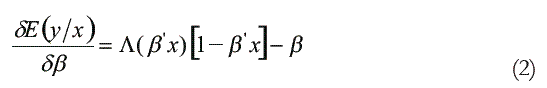 (Greene, 1999). Los parámetros del modelo logit son estimados por el método de máxima verosimilitud.1 El efecto marginal del modelo logit presentado en (1) se obtiene como:
