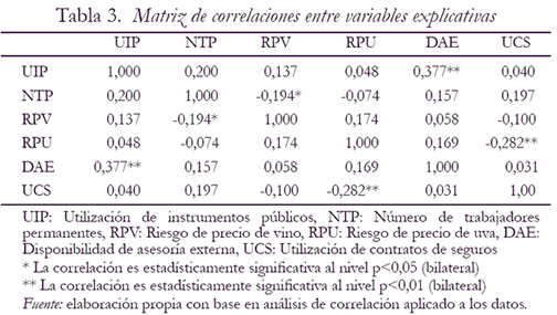 La tabla 2 muestra las correlaciones (Rho de Spearman) entre las variables del modelo. Se observa una relación positiva y significativa entre la variable dependiente Utilización de instrumentos públicos (UIP) y Disponibilidad de asesoría externa (DAE). Por otra parte, en el caso de las variables Riesgo de precio de uva (RPU) y Utilización de contratos de seguros (UCS) existe una relación significativa y negativa, lo mismo ocurre con las variables Número de trabajadores permanentes (NTP) y Riesgo de precio de vino (RPV). La tabla 2 también muestra claramente que existe una relación no significativa entre la variable dependiente UIP y las variables NTP, RPV, RPU y UCS.