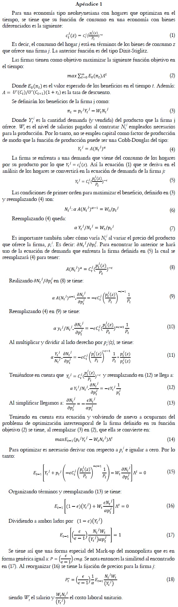 3 Un resumen de la derivación de la ecuación siguiente se hará en el apéndice 1. Para una derivación completa de toda la curva de Phillips neokeynesiana incluida esta ecuación ver Galvis (2010).
