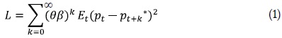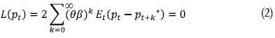 Donde Et(pt – pt+k*)2 describe las pérdidas esperadas de beneficios que tiene la firma en el tiempo t+k debido al hecho de que no puede ajustar el precio óptimo por algunas rigidices ese período. Es decir, pt es algo así como el precio que tiene que apegarse la firma por las rigideces. Por otra parte, β<1 implica que las pérdidas de hoy tienen más peso que las pérdidas futuras. Las pérdidas futuras son descontadas con (θβ)k. La incorporación de θ se debe a que existe una probabilidad θ de que las firmas dejen el precio hasta el período siguiente y, por lo tanto, se debe descontar las pérdidas por la probabilidad de que no mantenga efectivamente el precio fijo hasta el otro período (Whelan, 2009). Pasemos ahora a optimizar la función de pérdida.