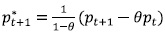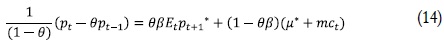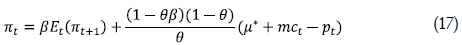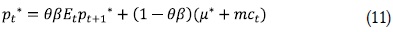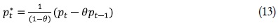 Donde cada variable está expresada como un porcentaje de desviación con respecto a un nivel de inflación cero4. Sólo unas firmas vuelven a fijar el precio y esa probabilidad de que lo hagan es (1 – q). Este componente es captado por la parte de la ecuación (1 - θ)pt*. Así θ es la probabilidad de no alterar el precio y es independiente del tiempo pasado desde la última revisión, lo cual es captado en la ecuación mediante θpt-1.