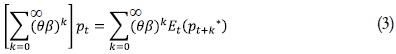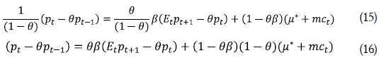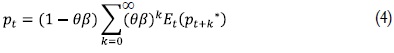 Por lo tanto, esta ecuación nos dice que el precio óptimo para la firma establecer sería igual a una media ponderada de los precios que hubiera esperado poner en el futuro si no hubiera rigideces de precios. Es decir, como no se puede cambiar el precio en cada período la firma opta por mantenerse cerca del promedio del precio correcto o sin rigideces (Whelan, 2009).