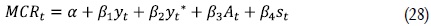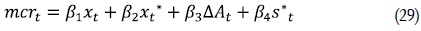 Siendo mcrt la brecha de los costos marginales reales, xt la brecha del producto del país doméstico, xt* la brecha del producto del Estados Unidos, ΔAt es el cambio en la productividad total de factores y s*t la brecha de los términos de intercambio18.