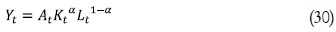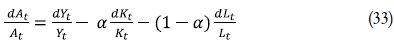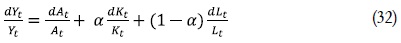 es la tasa de crecimiento de la productividad multifactorial. Por último, α y (1– α) son las proporciones que representan la remuneración del capital y el trabajo en el producto.