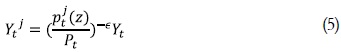 Donde Yt, Pt son el producto agregado de la economía y el nivel de precios respectivamente. pjt(z) es el precio (en logaritmos) al que se enfrenta la firma j para su bien z. El producto de la economía es la suma del producto de todas las firmas las cuales producen con base en la siguiente función de producción: