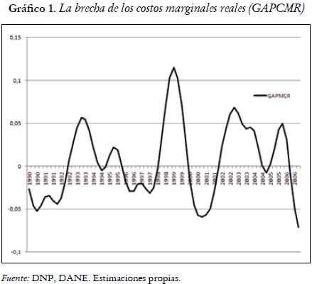 Aunque no se encuentra evidencia fuerte para una relación entre la brecha del producto y la brecha de los costos marginales reales, ni en el corto plazo aún como en los resultados hallados por Bejarano (2005), es posible que la relación se esté dando vía el cambio en la productividad total de factores. Esto en cierta manera va en dirección de resultados que sugieren que la brecha del producto posiblemente tenga fundamentos teóricos que no la hacen tan ad-hoc como hasta entonces teóricamente se ha venido suponiendo. Para la corriente neokeynesiana, por ejemplo, la brecha del producto es la desviación del producto de su nivel natural en ausencia de rigideces nominales y es posible mediante supuestos en la tecnología construir una medida de la brecha del producto (Galí, 2000).