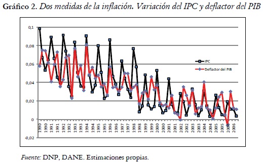 Se debe tener en cuenta que en los últimos años se ha venido dando una discusión amplia sobre la pertinencia de adoptar el supuesto anterior, sobre todo, para lo que se refiere a las estimaciones empíricas ya que, según autores como Galí (2000), el concepto de brecha del producto usado en los modelos teóricos de la nueva curva de Phillips es muy distinto al usado en las estimaciones empíricas. Dicho autor afirma que usar el PIB sin tendencia (la serie filtrada) como una proxy de la brecha del producto no tiene justificación porque dicho enfoque asume que el nivel natural de producto puede ser representado como una función con tendencia suave en el tiempo. No obstante, según Galí (2000), la teoría implica que cualquier shock, diferente a los monetarios, puede provocar fluctuaciones del nivel natural del producto lo que hace que este resulte más bien bastante volátil y de hecho, apoyándose en la teoría del ciclo real se podría sugerir que el nivel natural de producto puede tener fluctuaciones a manera óptima15. A pesar de esta falencia en las aplicaciones empíricas, no hay aún un fuerte fundamento teórico para estimar correctamente la brecha del PIB y en este trabajo se estimará la brecha a la manera usual.