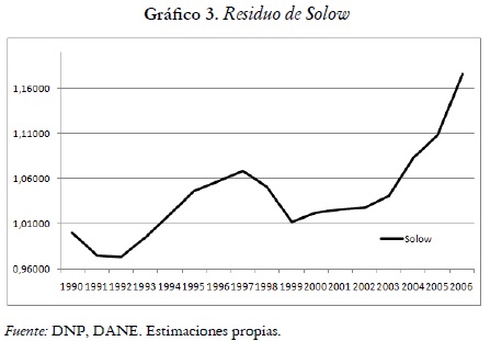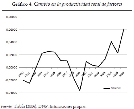 se reconstruye la serie de la productividad multifactorial (Solow, 1957). Para la economía colombiana el cambio técnico o productividad total de factores, At, evoluciona en el tiempo según cálculos propios acorde al siguiente gráfico: