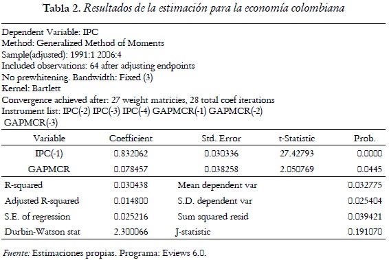 Normalmente se suele suponer expectativas adaptativas y se tiene así que Et(πt+1) = πt-1. Para la estimación se usará en este trabajo tres rezagos de πt–1 como variables instrumental de πt–1 debido a que esta serie se ajusta bien a un proceso estacional de orden tres. Por otra parte, se usarán tres rezagos de como variable instrumental para la brecha de los costos marginales reales debido primero a que esta variable es estacional de orden tres y segundo porque los datos son trimestrales. También los rezagos incluidos están justificados desde el punto de vista de ajuste del modelo, ya que a medida que vamos introduciendo más variables instrumentales el ajuste aumenta hasta un punto óptimo y después cae el ajuste. Para nuestros datos el óptimo se acerca bastante con la utilización de tres variables instrumentales por el lado de las variables independientes. Con lo dicho anteriormente se procede a estimar la curva de Phillips neokeynesiana para Colombia en el período 1990:Q1 – 2006:Q4 en el programa Eviews 6.0. Los resultados son: