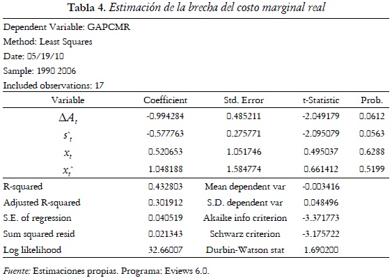 Es necesario aclarar que la variable s*t es estacionaria mediante la prueba de raíces unitarias de Dickey-Fuller. Por otra parte la variable ΔAt sólo pasa la prueba de raíces unitarias de Dickey-Fuller al 10%, pero realizando una inspección visual al correlograma de dicha serie se encuentra que ella es estacionaria. Por último, las series mcrt , xt y xt* son brechas de las series de los costos marginales reales, PIB de Colombia y PIB de Estados Unidos respectivamente con respecto a su nivel estacionario y como toda brecha son estacionarias por construcción. Por lo tanto, se puede realizar una estimación de mínimos cuadrados ordinarios sin peligros de caer en regresiones espurias para la ecuación (34). Los resultados de la estimación en el programa Eviews 6.0 son: