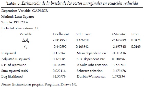 Con respecto al valor negativo encontrado para el coeficiente de ΔAt igual a -0,814950 va acorde con lo que se esperaba teóricamente, ya que es de esperarse que los cambios en la productividad total de factores disminuyan los costos marginales reales. Por otra parte se esperaba que el coeficiente asociado a la brecha de los términos de intercambios, s*t, fuera positivo debido entre otras cosas a que ellos son una fuente de demanda que jalonan los salarios20 y por tanto los costos marginales reales, no obstante, es posible que en economías con tasas de desempleo alto y un alto componente de insumos importados no tenga por que existir necesariamente un efecto directo entre costos marginales reales y los términos de intercambio.