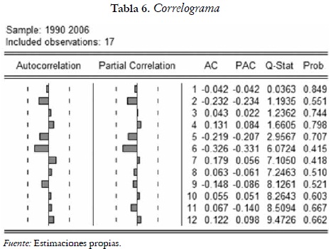 Pruebas econométricas en la estimación del modelo mcrt = β1ΔAt + β2st*. A continuación se muestra el correlograma de los residuales realizado en el programa Eviews 6.0: