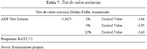 Mediante una prueba de raíces unitarias Dickey-Fuller aumentada a los residuales, sin tendencia y sin intercepto una vez que se ha determinado en el programa RATS 7.0 que dichas variables no son significativas, se tiene lo siguiente: