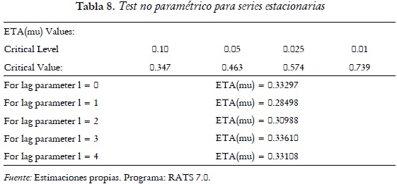De la tabla 7 se tiene que es posible al 5% de significancia rechazar la hipótesis de correlación serial o de raíces unitarias. Todas estas pruebas sobre los residuales confirman que el estadístico Durbin-Watson de la tabla 5 que es DW=1,5928 tiende a un valor de igual a 2,0 por lo que los residuales se comportan bien. Como última prueba para raíces unitarias se muestra a continuación una prueba no paramétrica de raíces unitarias, el test KPSS. Se observa primero en la tabla 8 como la prueba con el ETA(mu) para las raíces unitarias en los residuales sin tendencia y con constante se tiene que al 5% de significancia el ETA(mu)=0,463 es mayor a todos los ETA(mu) de los rezagos con lo que se tiene que no hay raíces unitarias.