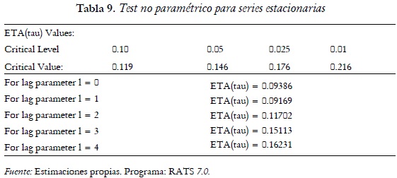 Por otra parte en la tabla 9 con el ETA(tau) para las raíces unitarias en los residuales con tendencia y con constante se tiene que al 5% de significancia el ETA(tau) = 0,146 es mayor a casi todos los ETA(tau) de los rezagos con lo que se tiene que no hay raíces unitarias.