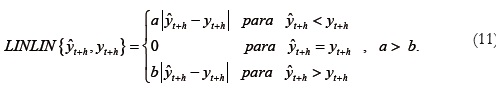 Aquí a indica los costos en los que se incide por la venta de un activo financiero y que éste suba de valor, y b representa la sobreestimación de la compra de un activo y que éste resulte con un precio observado más bajo. Adicionalmente, a y b son parámetros suavizadores que penalizan menos fuertemente los valores pronosticados más alejados del origen del valor observado, consiguiéndose deducciones más sólidas en la evaluación de un pronóstico (Jalil y Misas, 2007; Londoño et al., 2010)19.