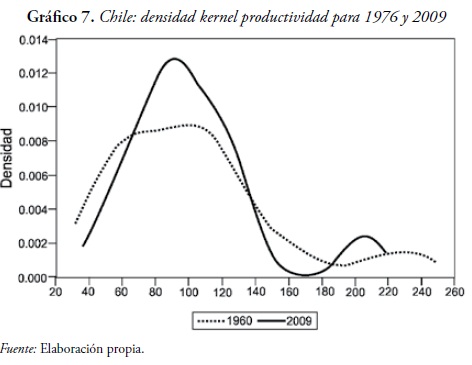 Respecto a las funciones de densidad para la distribución regional de la productividad en Chile se aprecia lo siguiente: