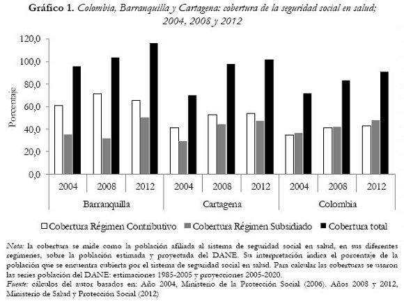 Con la expedición de la Ley 100, Colombia inició sus planes de cobertura universal por medio del aseguramiento del grupo familiar al régimen contributivo y el preludio del régimen subsidiado. Bajo esta directriz se lograron importantes avances en términos de afiliación para la población. Lo anterior puede constatarse al revisar las cifras oficiales, las cuales indican, como se ilustra en el Gráfico 1, que la cobertura aumentó considerablemente entre 2004 y 2012, teniendo en cuenta la población estimada y proyectada por el DANE. Dicho gráfico muestra cómo el porcentaje de afiliados al sistema en Colombia pasó de 72% en 2004 a 91% en 2012. En Cartagena se ubicó en 102% para el último año, con un incremento de 32% en la población asegurada durante el periodo estudiado. Barranquilla, por su parte, presenta desde 2008 una cobertura superior al 100%, al punto que en 2012 esta fue mayor en dieciséis puntos porcentuales (pp) a la población proyectada.