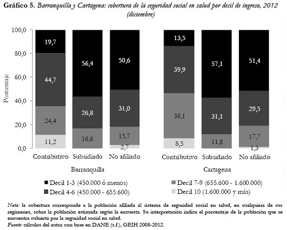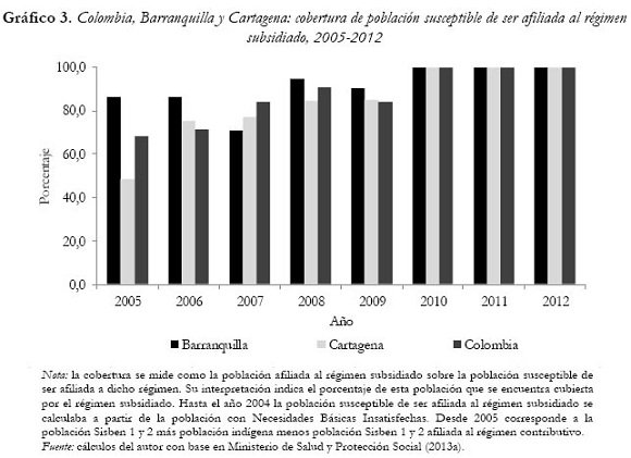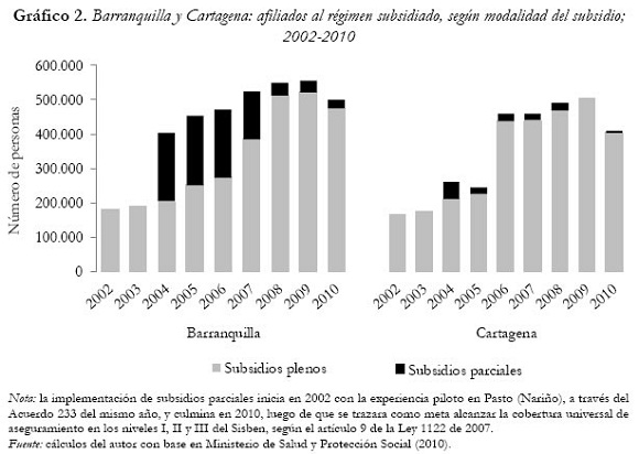 Si bien son notables los resultados en términos de población asegurada, no es preciso afirmar que la cobertura universal ha sido alcanzada debido a la poca confiabilidad de las cifras oficiales. Estas, al ser contrastadas con encuestas representativas en el territorio nacional, presentan inconsistencias y sobredimensionamiento de los datos. La afiliación de un mayor número de personas en el régimen subsidiado propició el avance registrado en la cobertura total, sin embargo, los mecanismos utilizados para lograr esta mayor afiliación no fueron los más convenientes. En Barranquilla la cobertura en el régimen subsidiado fue ampliada mediante los subsidios parciales, mientras que en Cartagena se efectuó a través de un proceso de afiliación masiva. En el primer caso dicha implementación supone una garantía parcial en el plan de beneficios al que tienen derecho los asegurados y en el segundo, a pesar de que cubre la totalidad del plan, debió garantizarse de forma inmediata a un gran número de afiliados entre un año y otro. Lo anterior podría considerarse como un desequilibrio del sistema en ambas ciudades, puesto que sus esfuerzos fueron dirigidos a la afiliación del mayor número de usuarios posibles para alcanzar la cobertura universal en el régimen subsidiado, sin tener en cuenta los alcances que esto pueda tener en la equidad y calidad de los servicios prestados. Sumado a esto, un porcentaje considerable de la población con menos recursos no está asegurada y personas con capacidad de pago se encuentran afiliadas al régimen subsidiado.