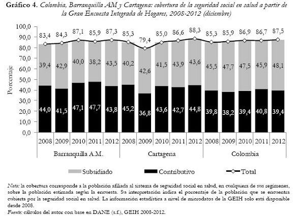 Como se mencionó anteriormente, la cobertura en salud creció notablemente a mediados de la última década; sin embargo, no es posible asegurar que la cobertura universal haya sido alcanzada, dada la poca confiabilidad de las cifras oficiales debido a la ausencia de una depuración sistemática y continua de las cifras de afiliados. Este hecho origina problemas, siendo los más frecuentes la doble afiliación y la afiliación sin derecho al régimen subsidiado (Stefano, Granados & Vergara, 2006). Cartagena y Barranquilla no son ajenas a estas irregularidades: para la primera ciudad Viloria (2005) aduce inconsistencias en la información, mientras que para la segunda Gari & Rada (2008) señalan que existe un sobredimensionamiento de los datos.