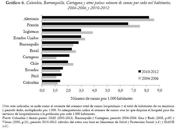 A pesar de que la infraestructura de servicios hospitalarios de estas dos ciudades ha mejorado, el número de camas por cada mil habitantes se encuentra por debajo de la norma internacional recomendada por la OMS –4 a 4,75 camas por cada 1.000 habitantes para poblaciones mayores de 100.000 personas– y de los valores registrados para este indicador en países como Alemania, Francia, Inglaterra y Estados Unidos. Pese a estar por encima del promedio nacional como se observa en el Gráfico 6.