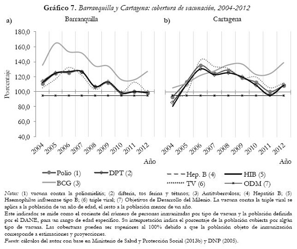 En el contexto regional, las coberturas de vacunación entre 2004 y 2012 señalaron importantes avances para las ciudades analizadas. Durante este periodo, la cobertura universal fue alcanzada para todas las vacunas11, como se ilustra en el Gráfico 7. La vacuna contra la poliomielitis (polio) cobijó en promedio un 111% y un 115% de la población menor de un año de Barranquilla y Cartagena, respectivamente. Sumado a eso, la población de un año en ambas ciudades estuvo cubierta en un 111% y un 118% contra la triple viral (TV). Barranquilla se destacó por mantener altas coberturas en la mayoría de vacunas, especialmente en la prevención de la tuberculosis.