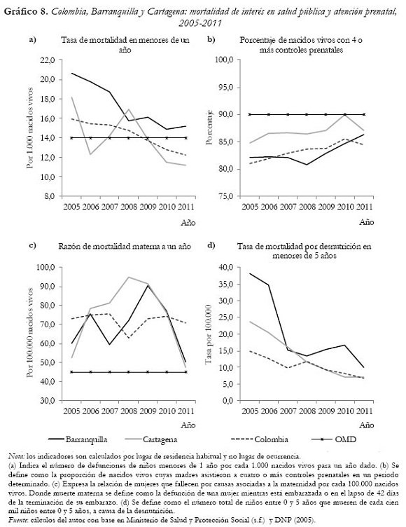 A pesar de los logros alcanzados en términos de cobertura e infraestructura de servicios, los indicadores de mortalidad de interés en salud pública reflejan otra realidad al interior de las ciudades estudiadas. Si bien los niveles de mortalidad infantil se han reducido en ambas ciudades, promediaron valores por encima del nacional, hecho que podría estar asociado a los bajos porcentajes de cobertura de nacidos vivos con más o cuatro controles prenatales. Asimismo, los niveles de mortalidad materna evidencian la fragilidad de los servicios de salud, porque promediaron tasas notablemente superiores al registro nacional. Sumado a esto, las cifras de mortalidad infantil por desnutrición son altas, y solo hasta hace un par de años sus niveles se aproximaron al nacional, considerando la brecha existente a mediados de la primera década del presente siglo. Como resultado, los Objetivos de Desarrollo del Milenio aún no han sido alcanzados por estas ciudades en términos de mortalidad materna y control prenatal, y en la capital del Atlántico en términos de mortalidad infantil. En contraste, y como hecho destacable, los programas de cobertura de vacunación han sido exitosos al cobijar a toda la población objetivo durante un periodo prolongado.