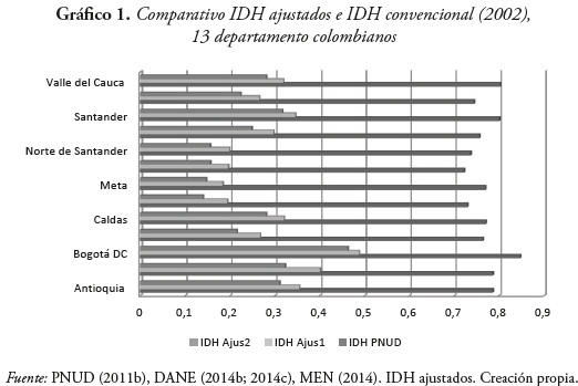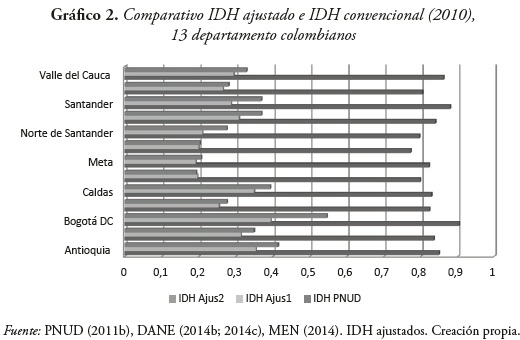 Estas diferencias tan marcadas tienen mucho que ver con la forma cómo se construyen los índices, resaltando con ello que el IDH convencional no es capaz de incorporar la naturaleza y especificidades de los territorios, entre otros, por los problemas característicos de los departamentos colombianos, como la informalidad laboral y los logros alcanzados a nivel territorial en educación media y superior. Sin embargo hay que reconocer que el PNUD ha logrado incorporar fenómenos como la violencia y la desigualdad de ingresos, de acceso a la tierra, de género, así como las diferencias étnicas en los logros recientes en materia de desarrollo humano, lo cual representa una invitación permanente a tratar de perfeccionar los indicadores con los que se suele evaluar los resultados del desarrollo y el crecimiento económico.