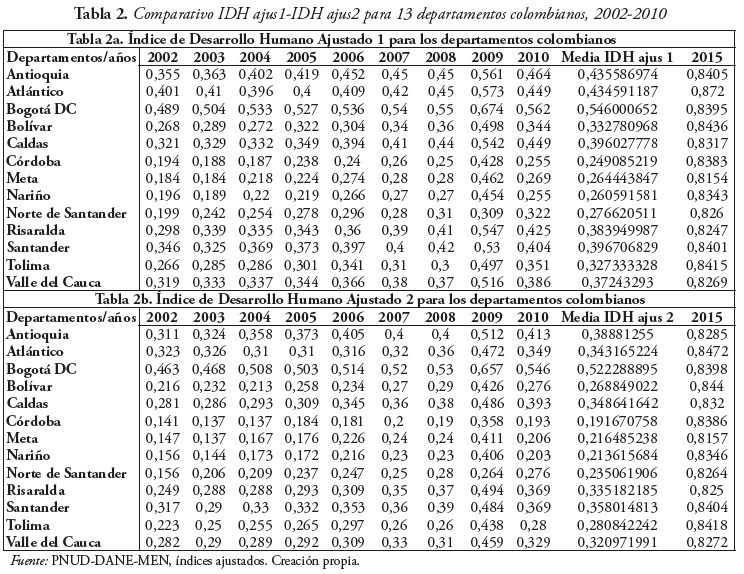 This research aims to estimate two adjusted human development indices for Colombia. The estimation is carried out for the period 2002-2010 and covers thirteen Colombian departments in order to disclose the effect produced by both labor informality and secondary and tertiary education on human development. The approach and methodology used is presented by the United Nations Program for Development (UNDP), save for a variation in the construction of educational attainment rates and per capita GDP. Results show that labor informality impairs human development, while greater coverage in secondary education and higher education have a positive influence on achievement as measured by the adjusted human development index for Colombia. This is essential for establishing policy recommendations from a regional and territorial perspective.