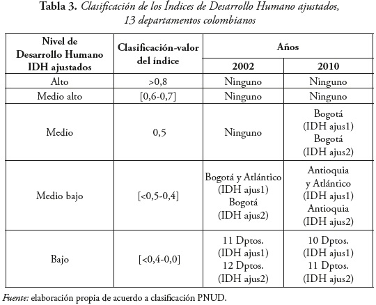 El resultado más relevante de la investigación muestra que Bogotá D.C., que ostenta los mayores logros en educación media y superior y menores tasas de informalidad laboral, presenta un mejor comportamiento en cada uno de los IDH ajustados. De manera inversa se evidencia un fuerte deterioro en el índice en los departamentos de Norte de Santander, Córdoba, Meta y Nariño. Al contrastar las estimaciones de acuerdo a los resultados alcanzados por cada índice ajustado en 2002 y 2010, respectivamente, se pueden clasificar los logros en desarrollo humano de la siguiente manera (Ver Tabla 3).