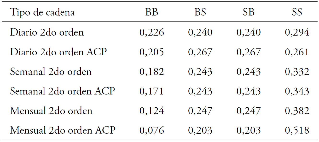 Dicho lo anterior, se observa que los resultados para ver la precisión de pronóstico de los modelos para las cadenas de primer orden (Tabla 9) tienen coherencia y relación con las probabilidades estacionarias de la Tabla 7 estimadas al ejecutar los modelos; igualmente se evidencia esta coherencia para las cadenas de segundo orden en las Tablas 10 contra los vectores de probabilidad estacionarios de la Tabla 8. Adicionalmente, se observa que las proporciones para los estados alcistas como S para cadenas de primer orden y SS para cadenas de segundo orden, tienden a ser significativamente más grandes que los otros estados B (primer orden) o BB, BS y SB (segundo orden), respectivamente, como se mostró en las estimaciones de los vectores estacionarios; se interpreta entonces que, en general, las acciones seleccionadas de los portafolios óptimos tienen tendencia alcista, y que si en un caso hipotético un inversionista decide contemplar una estrategia de inversión como la planteada, puede tener una utilidad positiva. Hay que mencionar que para los intervalos de tiempo mensuales en las cadenas de segundo orden solo se tienen tres realizaciones de los estados (ya que se toman solo los siguientes 4 meses) donde una es BS, con una proporción de 0,333 y las otras dos SS, con una proporción de 0,667.